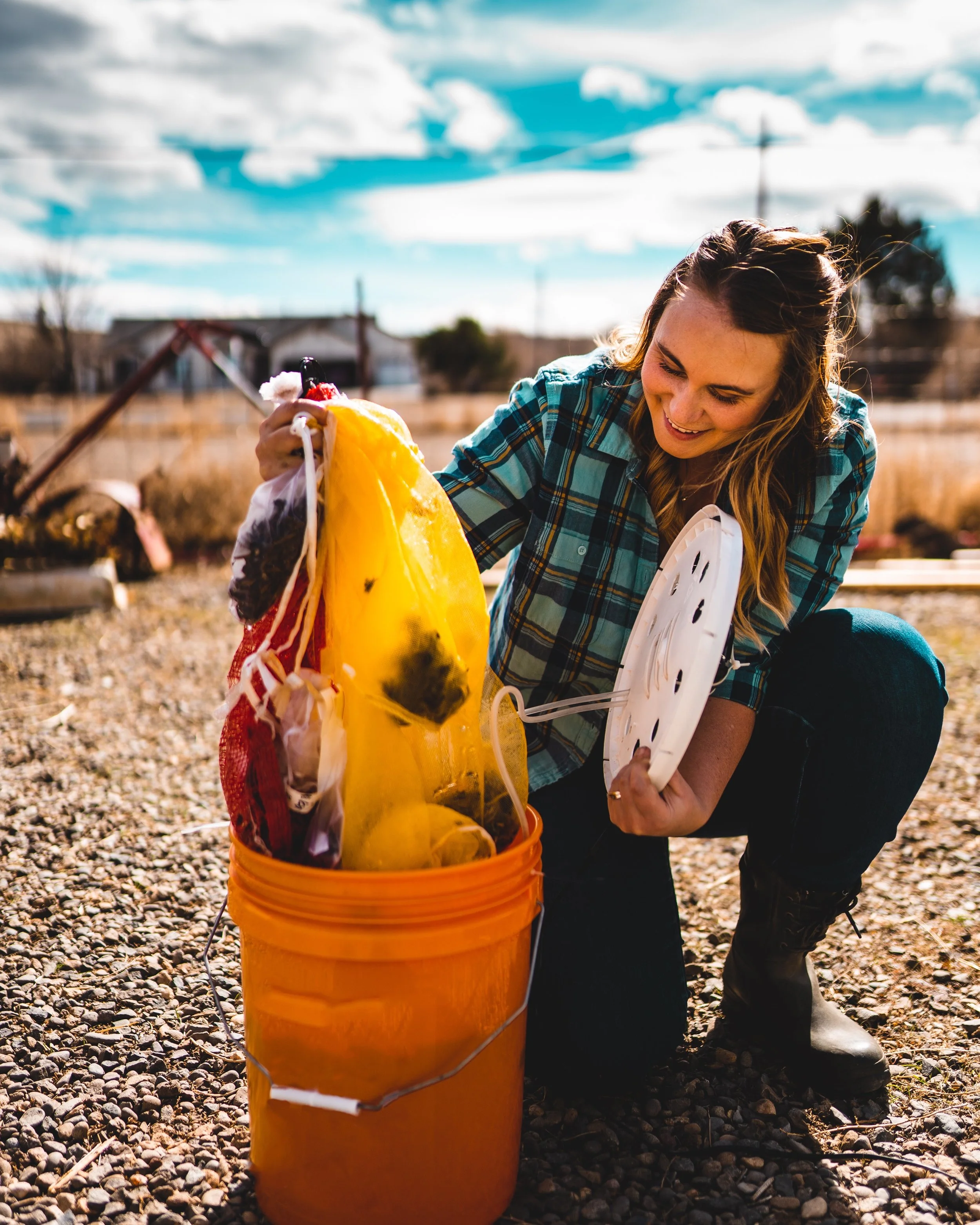 Setting up for corm soaking using a DIY system that doubles as a compost tea maker.